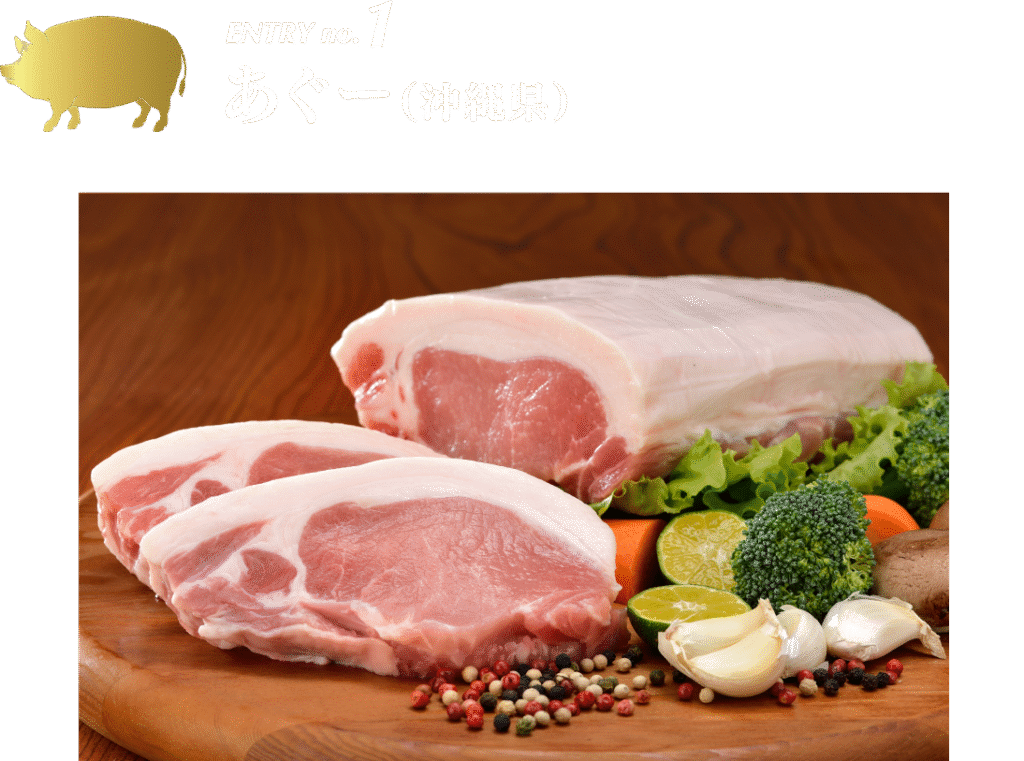 琉球在来豚アグーは600年程前に中国から沖縄に渡来し飼育されていた琉球島豚を基にして作られた小柄な豚です。この琉球在来豚アグーを雄方に、西洋種の雌を交配させて生まれてきた豚のお肉が「あぐー」です。この交配により、脂に特徴が表れ、うま味とさっぱりした味わいとなります。