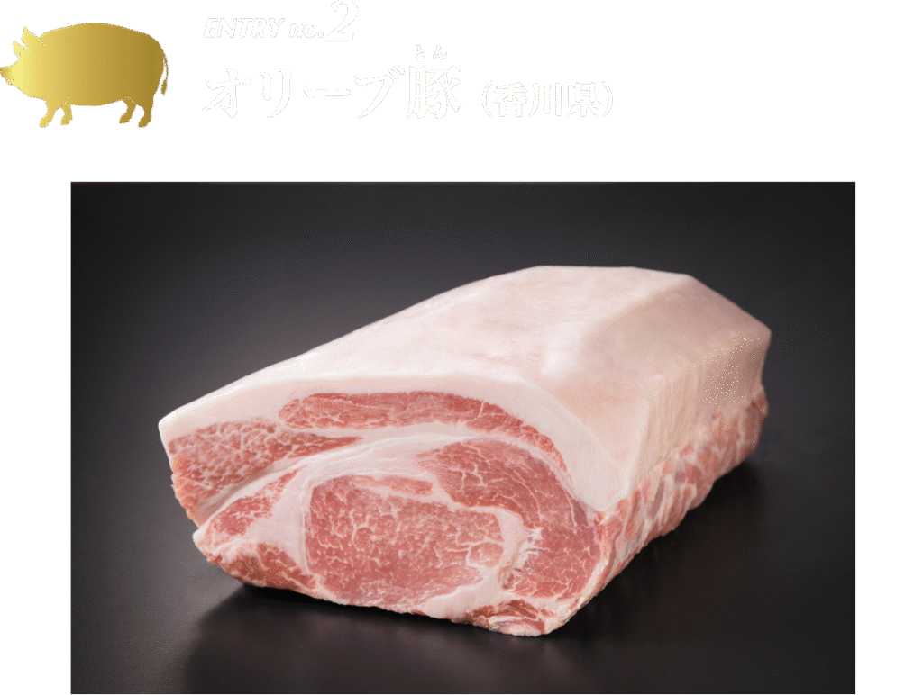 オリーブ豚(とん)とは、オリーブオイル採油後の果実から作られた「オリーブ飼料」を与えて育てた香川県畜産試験場開発のブランド豚です。今年で誕生10周年を迎えました。通常の餌で育てられた豚肉と比べて、フルクトースが約1.5倍多く含まれており、「赤身の甘味と旨味の強さ」と「さっぱりとした脂」が特徴です。