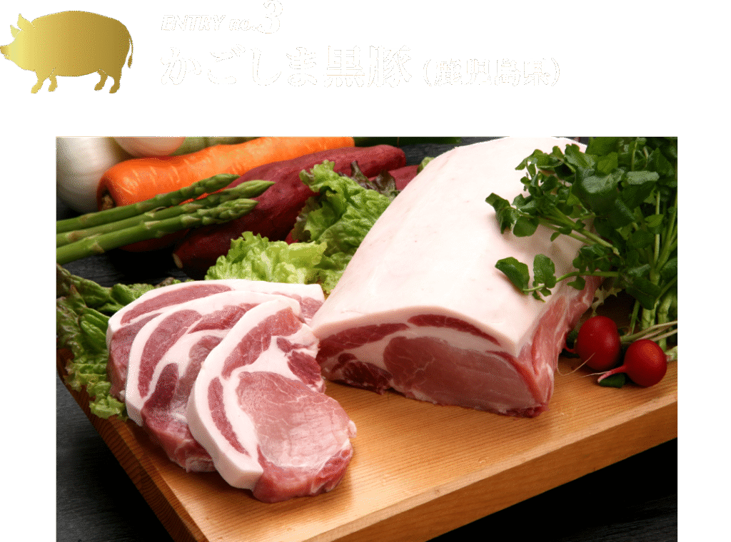 「鹿児島県黒豚生産者協議会」の会員が厳格なルールに基づき、さつまいも入り飼料を与え生産した黒豚。食肉のプロであるバイヤーを対象にした調査では、「味」など17項目中11項目で最高評価を獲得し、総合評価1位。口に入れると、やわらかく、歯切れよく、甘味と旨味があふれ出す、日本を代表するブランド豚肉。
